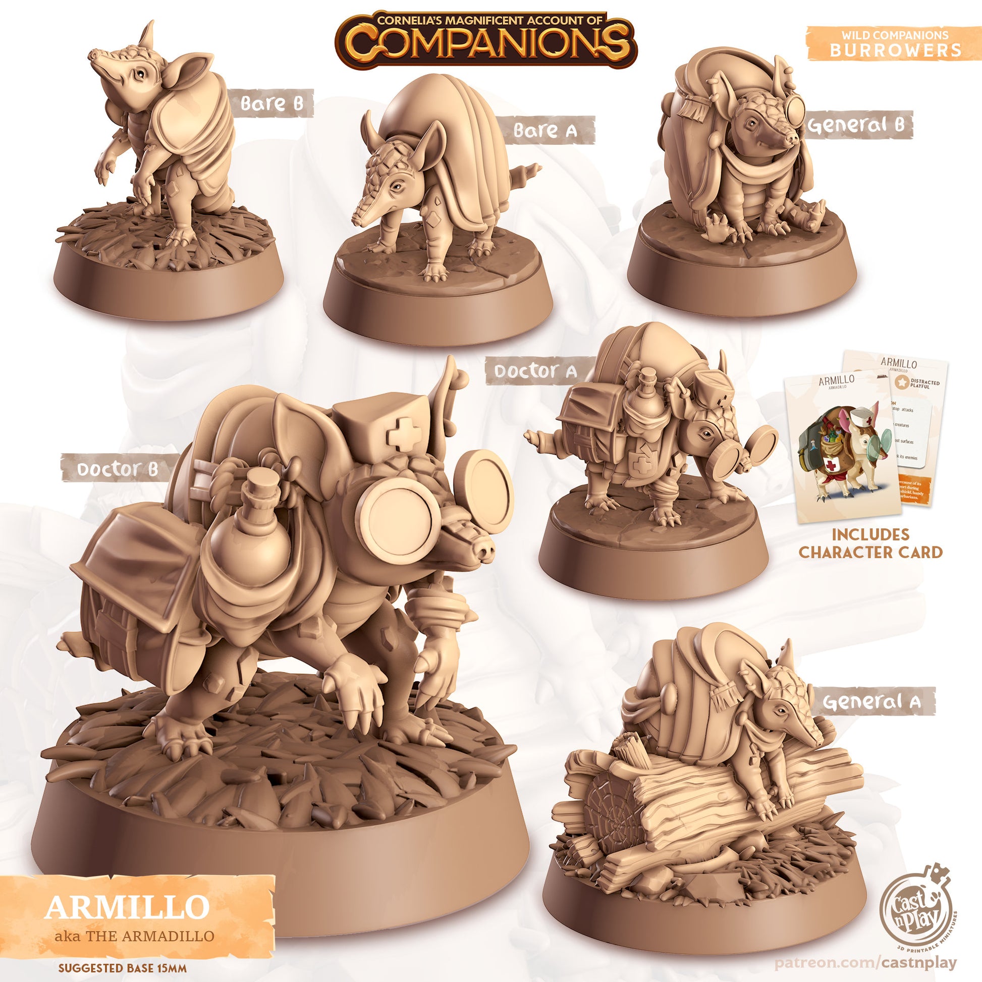 Armillo is available in 6 distinct variations. The printed character card is not included, but is available for an additional fee.